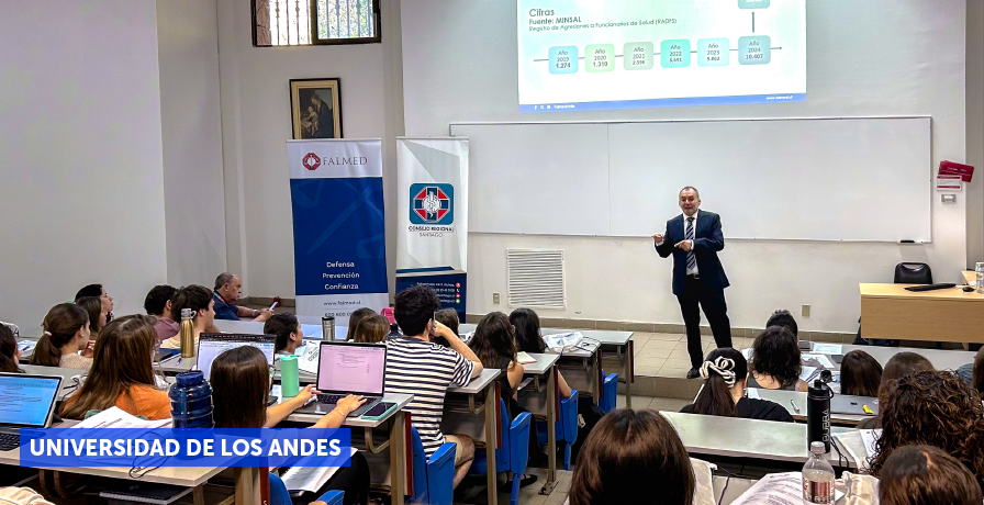 04/12/2025. En una instancia formativa dirigida a futuras y futuros profesionales de la salud, el abogado jefe nacional de la Fundación, Juan Carlos Bello, presentó los principales desafíos legales que enfrentan las y los médicos en el ejercicio clínico, destacando la importancia de la prevención y el acompañamiento que ofrece FALMED. La actividad fue organizada por el Consejo Regional Santiago de COLMED.