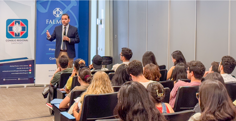 Fue el abogado FALMED, Ricardo Mella, quien -en la instancia organizada por el Consejo Regional Santiago de Colegio Médico - llevó a cabo la ponencia dirigida a los futuros médicos y médicas. El jurista inició con una breve reseña de la Fundación, revelando sus objetivos y cobertura. Además, entregó recomendaciones para comunicarse con los pacientes, aspectos como el consentimiento informado.