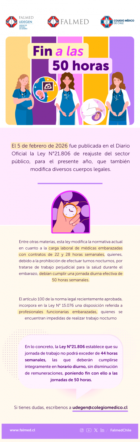 6/3/2026. En el marco de la conmemoración del Día Internacional de la Mujer, FALMED y su Unidad de Defensa de Género, UDEGEN, saludan a todas las mujeres que contribuyen día a día para lograr una sociedad que crezca y se desarrolle incluyendo la mirada de todos y todas. Enviamos un saludo especial a las médicas que forman parte de nuestra Fundación e invitamos a revisar una infografía y dos videos preparadas por las abogadas de UDEGEN que abordan: “Reconocimiento Jurídico y Corresponsabilidad en el Sistema Chile Cuida”, y “Trabajos peligrosos y fin a las 50 horas”.